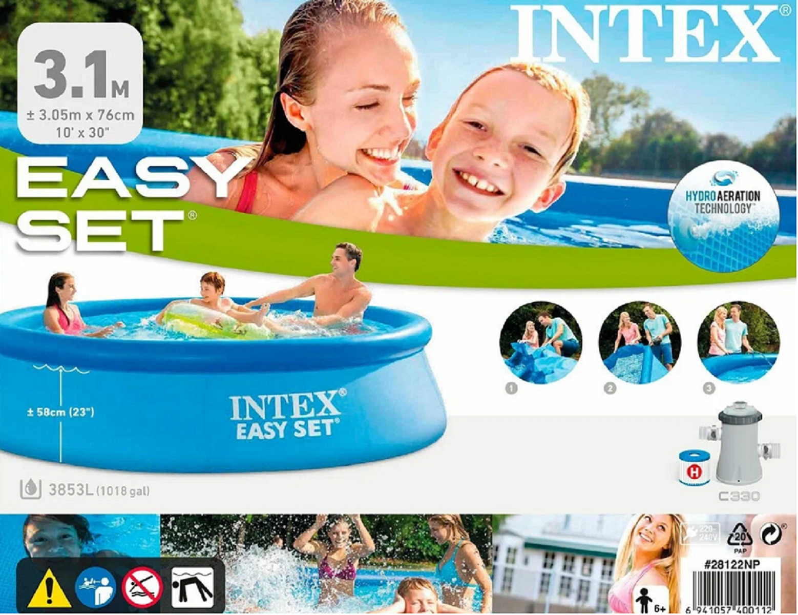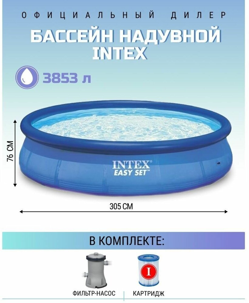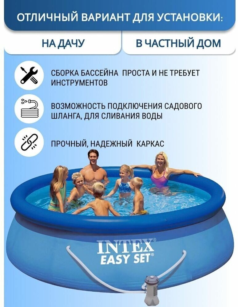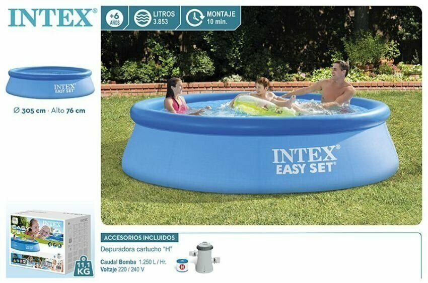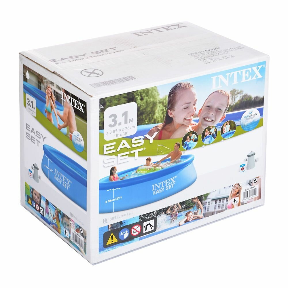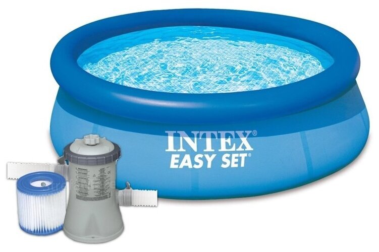 Бассейны серии Easy Set - отличная альтернатива сборным каркасным бассейнам. Технология SUPER-TOUGH дает стенкам бассейна тройную прочность. Стенки сделаны из трех отдельных слоев: два слоя плотного винила и один - внешний - полиэстр для особой прочности. Борта бассейна поддерживаются надувным кольцом, которое поднимается, по мере заполнения бассейна.Для установки бассейна нужна плоская, горизонтальная площадка. Процесс сборки и подключение бассейна занимает не более 10-15 минут. На холодное время года не рекомендуем оставлять бассейн на открытом воздухе. Имеется удобный сливной клапан, который можно присоединить к садовому шлангу.Бассейн оснащён картриджным фильтр-насосом. Насос простой и надёжной конструкции с двойной изоляцией и классом электрозащиты. Насос подключается к бассейну двумя шлангами, которые надёжно фиксируются хомутами. Размер: 366х76см.