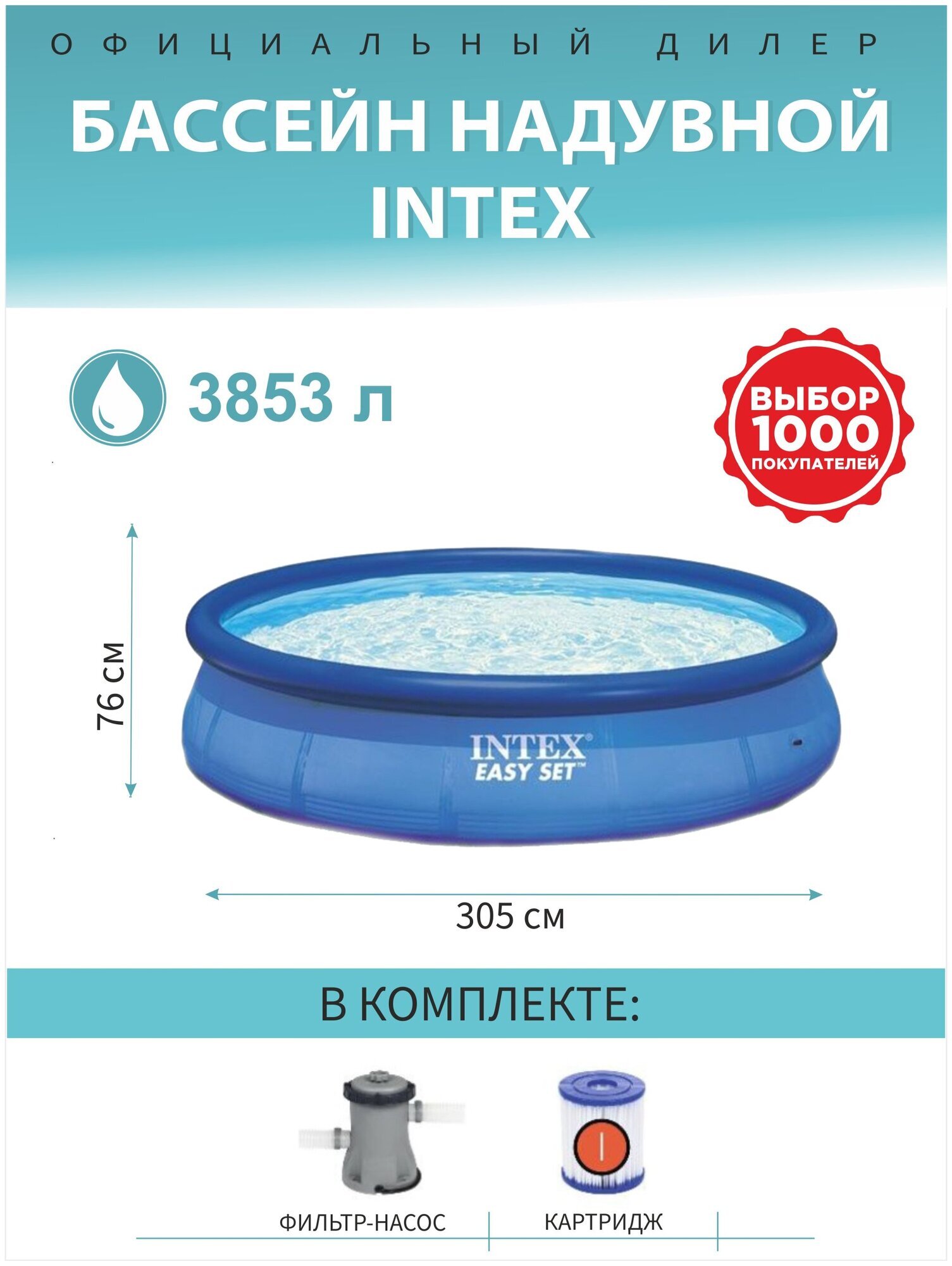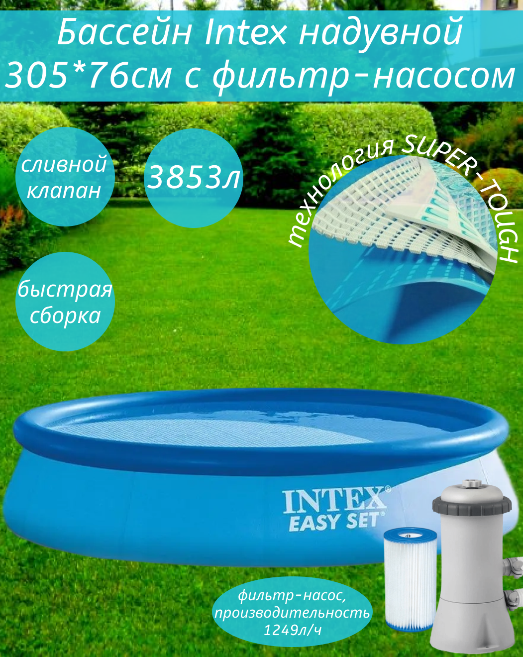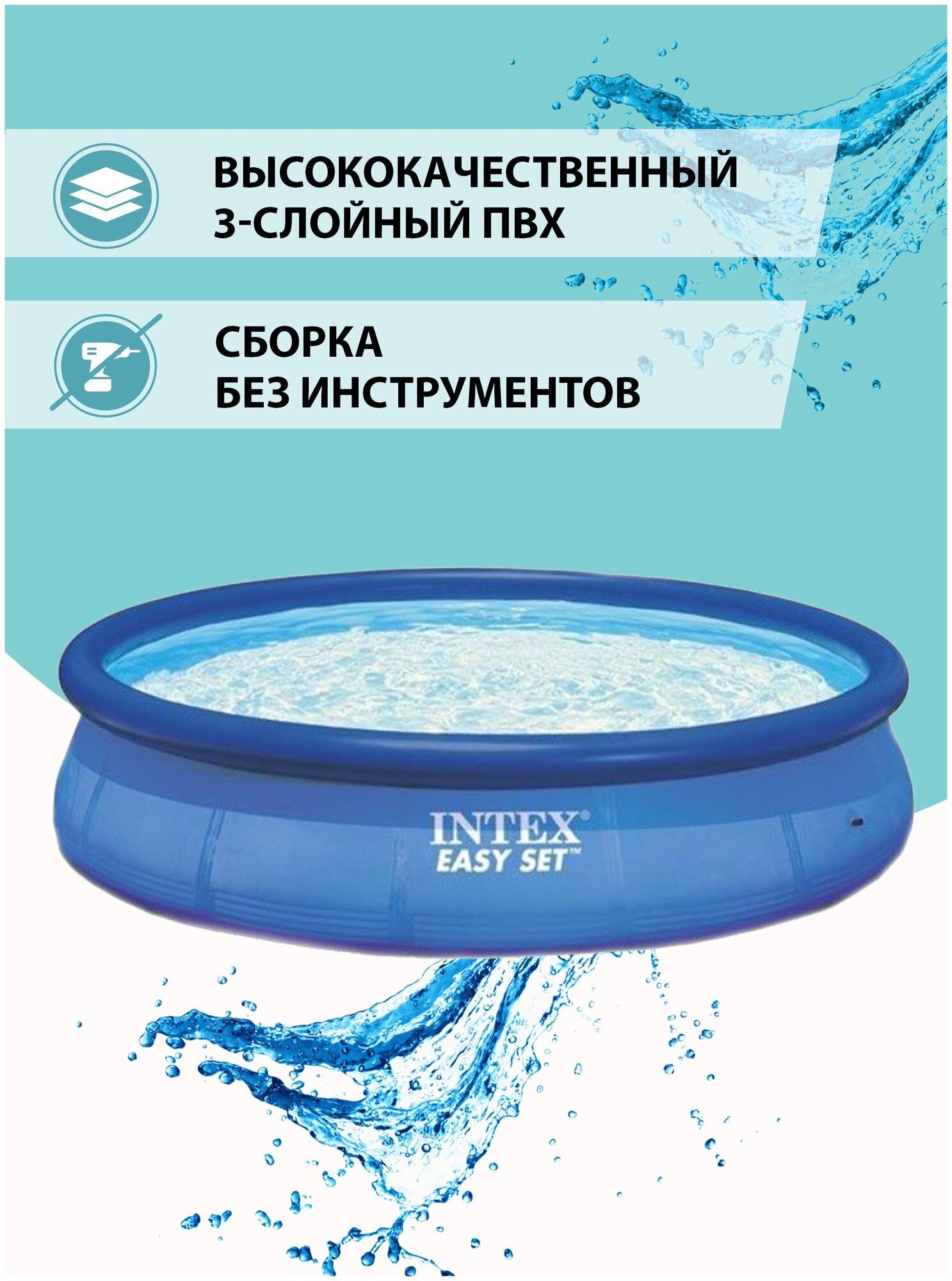 Бассейны серии Easy Set - отличная альтернатива сборным каркасным бассейнам. Технология SUPER-TOUGH дает стенкам бассейна тройную прочность. Стенки сделаны из трех отдельных слоев: два слоя плотного винила и один - внешний - полиэстр для особой прочности. Борта бассейна поддерживаются надувным кольцом, которое поднимается, по мере заполнения бассейна.Для установки бассейна нужна плоская, горизонтальная площадка. Процесс сборки и подключение бассейна занимает не более 10-15 минут. На холодное время года не рекомендуем оставлять бассейн на открытом воздухе. Имеется удобный сливной клапан, который можно присоединить к садовому шлангу.Бассейн оснащён картриджным фильтр-насосом. Насос простой и надёжной конструкции с двойной изоляцией и классом электрозащиты. Насос подключается к бассейну двумя шлангами, которые надёжно фиксируются хомутами. Размер: 366х76см.