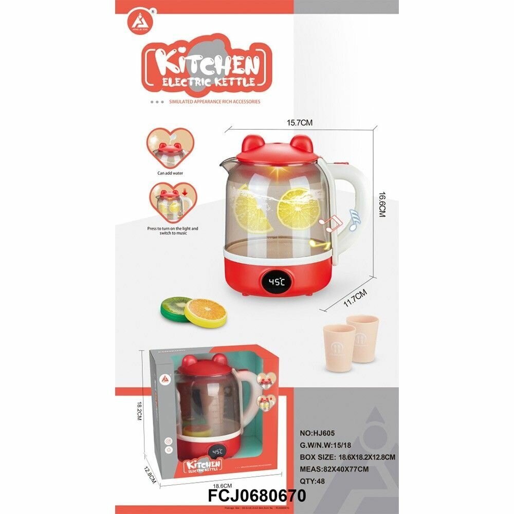 Размер изделия: 15, 7 х 11, 7 х 16, 6 см Функционал: детская игровая техника Вид упаковки: картонная коробка блистерного типа Страна-изготовитель: Китай Материал: полимеры Комплектация: чайник - 1 шт, стаканы - 2 шт, аксессуары - 2 шт. Возраст ребенка: для детей от 3 лет Чайник станет отличным дополнением к любой детской кухне и подарит множество часов веселой игры. Особенности: - световые и звуковые эффекты; - для работы необходимы 3 батареи ААА 1.5 V (не входят в комплект); - можно заливать воду; - яркий и стильный дизайн; - качественные материалы; - возможность собрать целый комплект из серии кухонных приборов. Цена за 1 шт