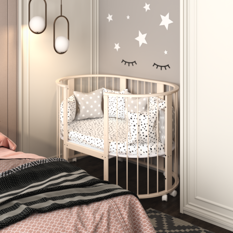 Достаточно всего лишь одного взгляда для того, чтобы понять, что круглая кроватка ЗАЙКА – оригинальная, добротная мебель наивысшего качества. Данная модель заинтересует в первую очередь тех пап и мам, которые нацелены на приобретение детской кроватки, изготовленной с использованием только натуральных материалов, обладающей расширенной функциональностью, и при том рассчитывают на небольшую стоимость. Ведь при всех преимуществах, кроватка имеет вполне бюджетную цену, а благодаря продуманной конструкции прослужит Вам долгие годы, сначала как маленькая колыбелька для новорожденного с удобным пеленальным столиком, а в дальнейшем как традиционная детская кроватка.