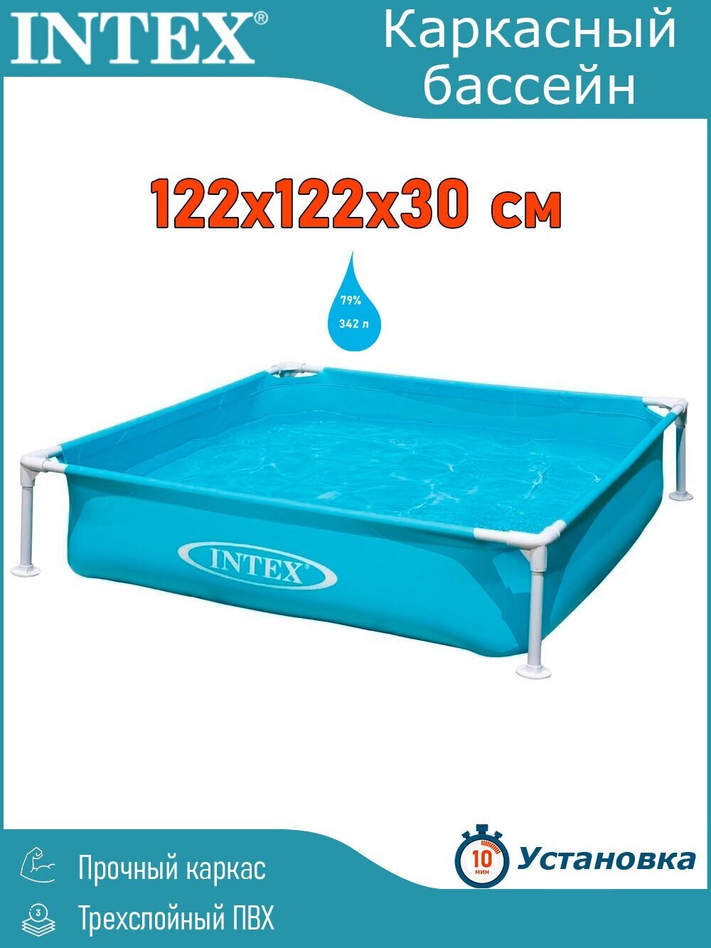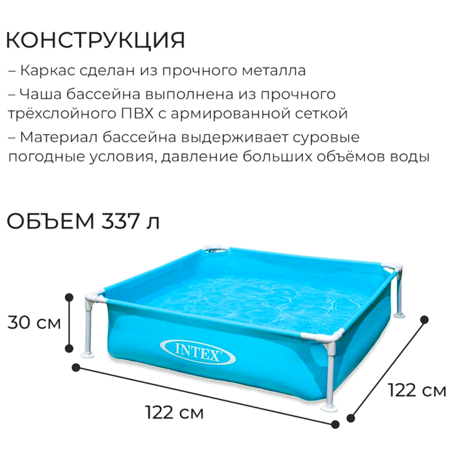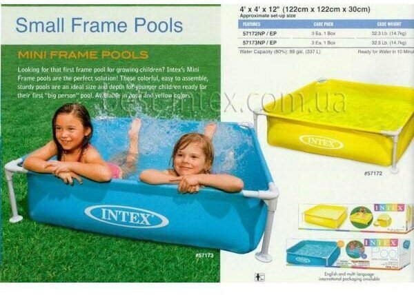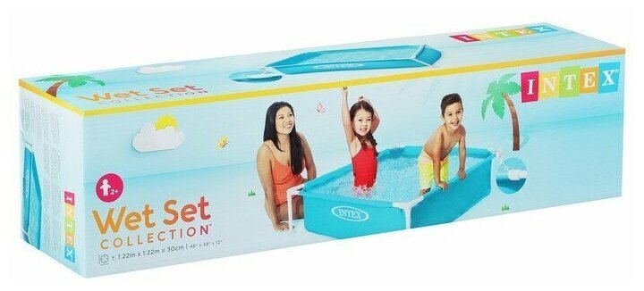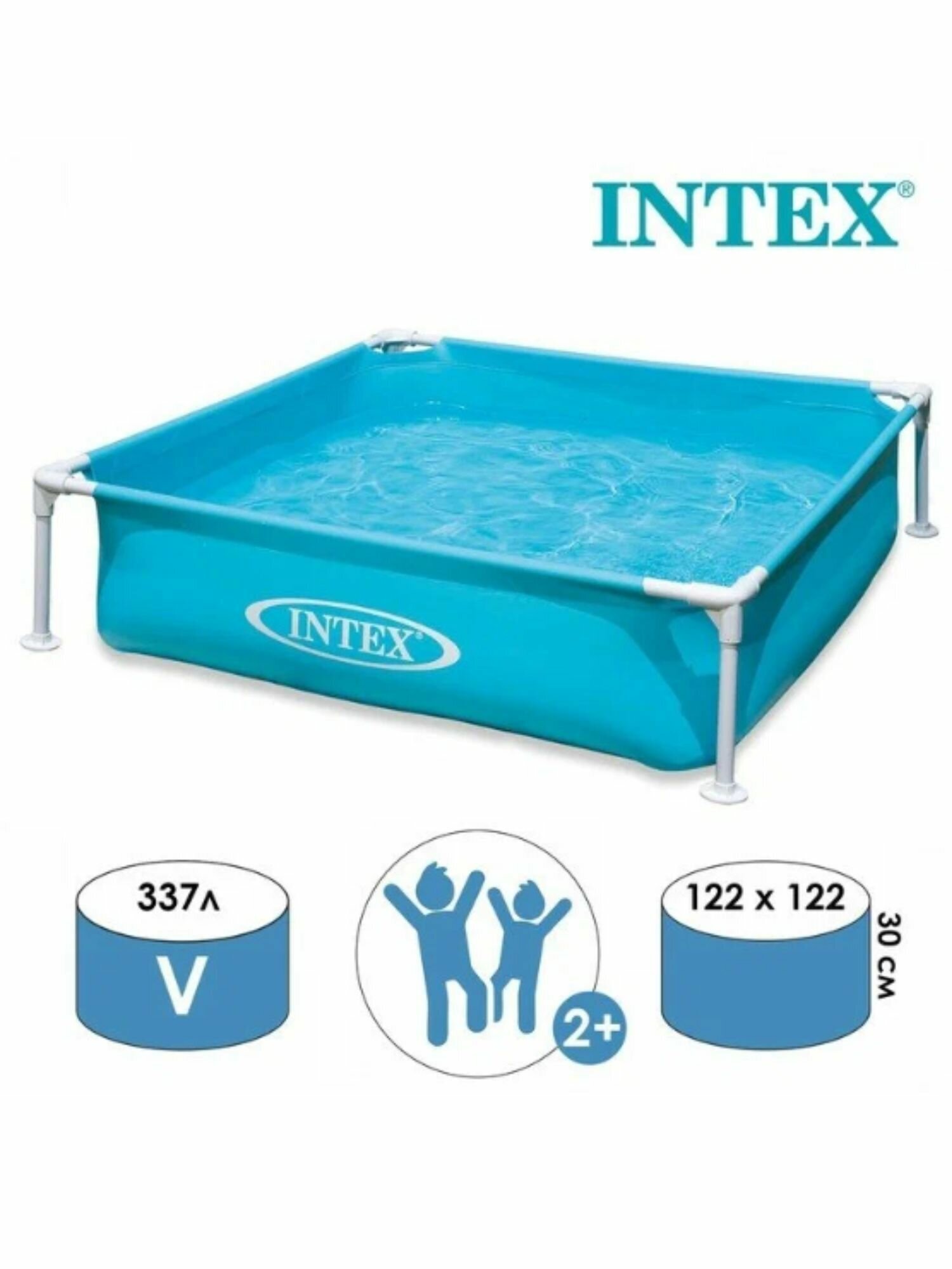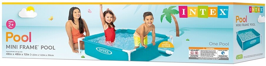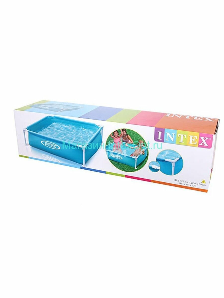 Бассейн каркасный детский 122х122х30см "Голубой" Intex Детский каркасный бассейн квадратной формы голубого цвета. Металлический каркас обеспечивает прочность конструкции. Чаша бассейна сделана из высококачественного плотного двухслойного винила толщиной 0,50 мм (стенки) и 0,25 мм (дно). Для комфортного и безопасного купания есть мягкие накладки на горизонтальных перекладинах. Бассейн легко уставливается за 10-15 минут. Для слива и чистки бассейна предусмотрен удобный сливной клапан. Ремонтный комплект прилагается. Предназначен для детей от 2 лет. Прост в установке и компактен в хранении. Внимание! Не устанавливайте детский бассейн на бетоне, асфальте или какой-либо другой жёсткой поверхности. Сливайте воду из бассейна, когда не пользуетесь им. Технические характеристики: Размеры, см: 122х122х30 Объем, л (80% наполнения): 337 Надувное дно: нет Глубина воды при рекомендуемом объеме, см: 24 Габариты упаковки, см: 63,00х16,00х16,00 Вес в упаковке, кг: 4,3 Комплектация: полотно, каркас, ремкомплект.