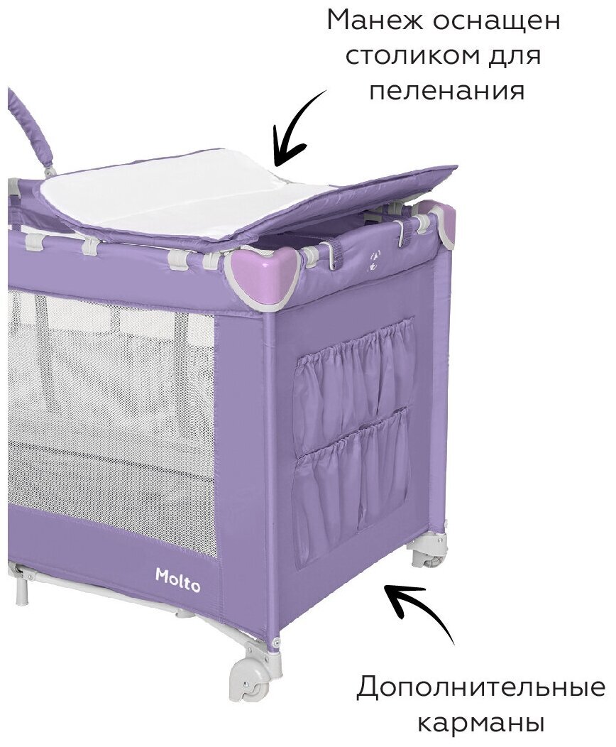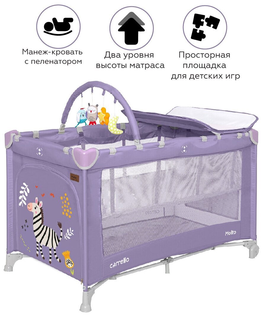 Carrello Molto CRL-11604 – манеж, позволяющий детям до 3 лет играть в безопасности под присмотром родителей. Взрослые могут наблюдать за ними через боковые стенки, выполненные из прозрачной сетки. Модель отличается прочной и устойчивой конструкцией и компактным складыванием. Малыш может играть с подвесными игрушками на дуге, а для его переодевания предусмотрен пеленальный столик. Благодаря наличию в комплекте дорожной сумки, этот манеж можно брать с собой в поездку и путешествие. Изделие выполнено из качественных материалов. Сбоку предусмотрена дверца на молнии, через которую с удовольствием будут пролазить малыши.
