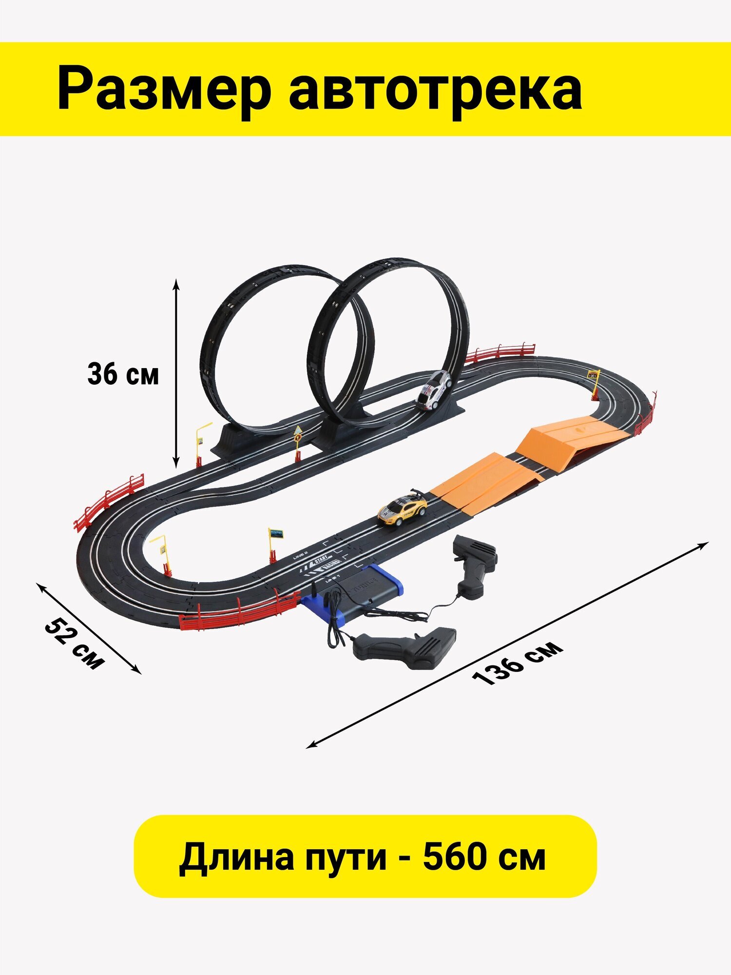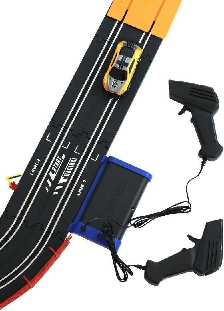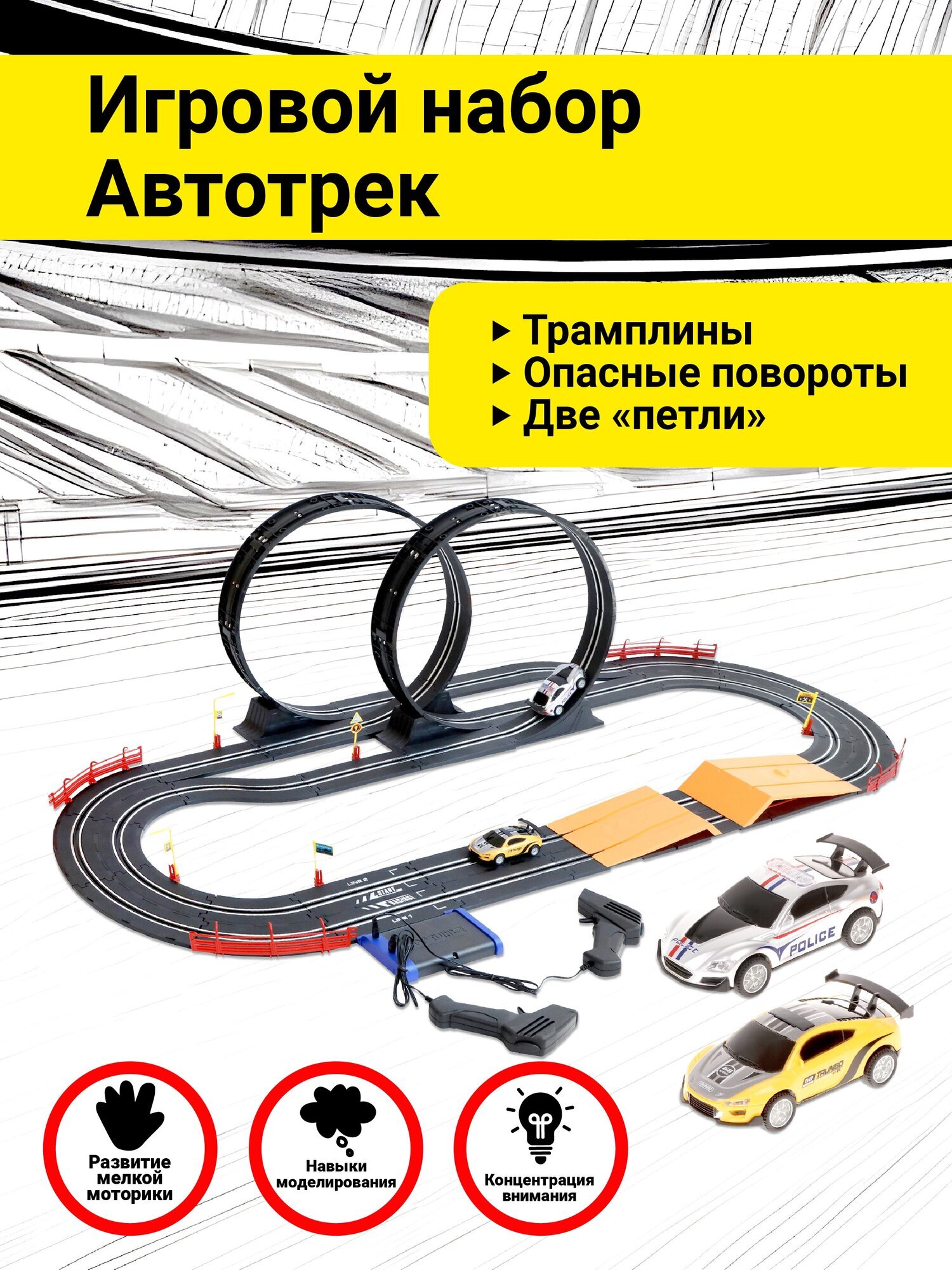 Игровой набор «Автотрек» подарит много часов увлекательной игры! В комплект входят 54 детали для сборки будущей автодороги и 2 машинки. В процессе сборки трека ребёнок будет развивать мелкую моторику рук, способность концентрировать внимание и навыки моделирования. Играть с автотреком очень весело и интересно! Здесь есть и опасные повороты, и трамплины, и даже две «петли»! Для игры потребуются 8 батареек типа АА (не входят в комплект). Управление машинками осуществляется с помощью пультов (входят в комплект): машинки устанавливаются на трек и буквально примагничиваются. Перед тем как поместить машинку на трек, «расправьте» контактные линии, расположенные на дне машин. В машинках предусмотрены световые эффекты. Размер собранной дороги (ДxШxВ) составляет 136х52х36 см (длина пути – 560 см). Ориентировочный размер машин (ДxШxВ): 10х5х3,5см. Изготовлено из пластмассы с элементами металла.