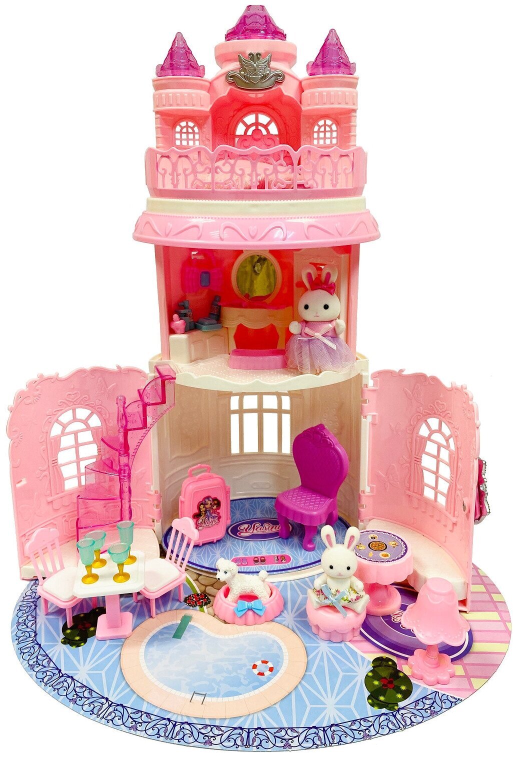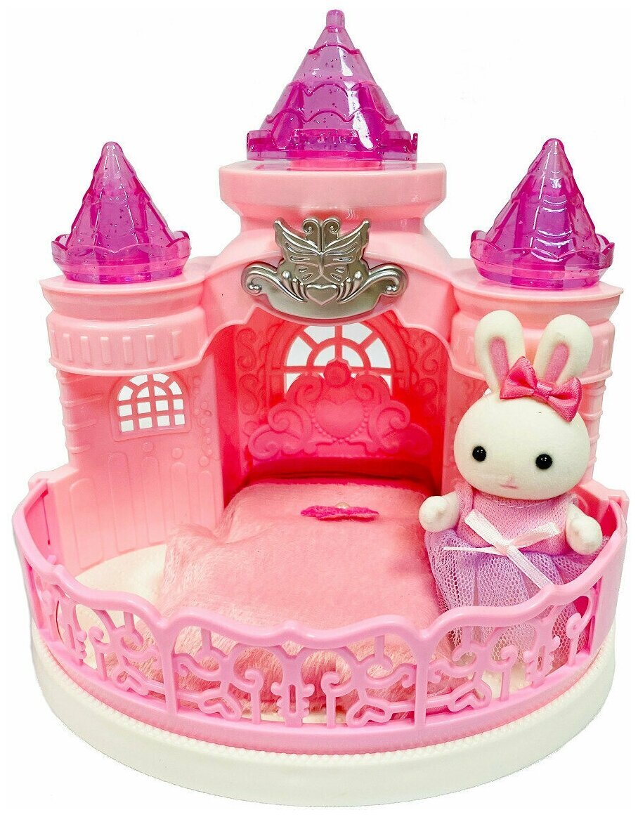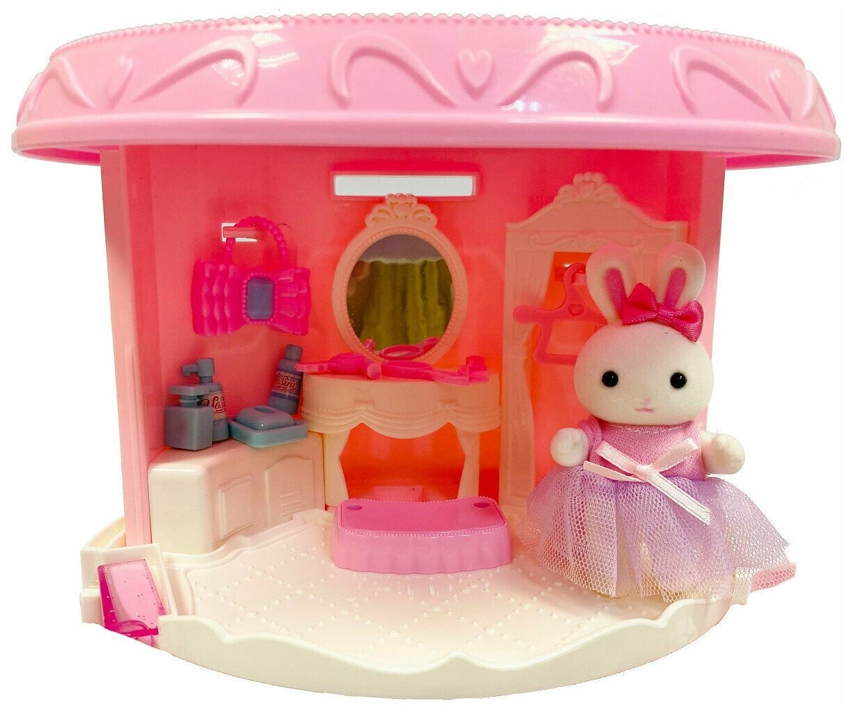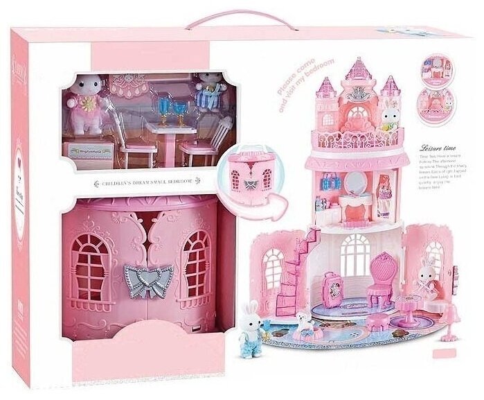 Этот игровой набор, включает в себя небольших зайчиков с мебелью и аксессуарами, которые представлены в замке. Замок собирается в небольшой сундучок с ручкой, поэтому его легко переносить с собой. Он станет отличным подарком для маленькой принцессы и поможет ребенку раскрыть все возможности своей фантазии. Предметы набора изготовлены из высококачественного нетоксичного пластика. Набор подойдет для ребенка от трех лет. Набор мебели очень хорошо детализирован. В комплект входят 2 фигурки зайчика, набор мебели: стол, стулья, туалетный столик, диван, тумба, различные аксессуары - посуда и украшения, чемодан.