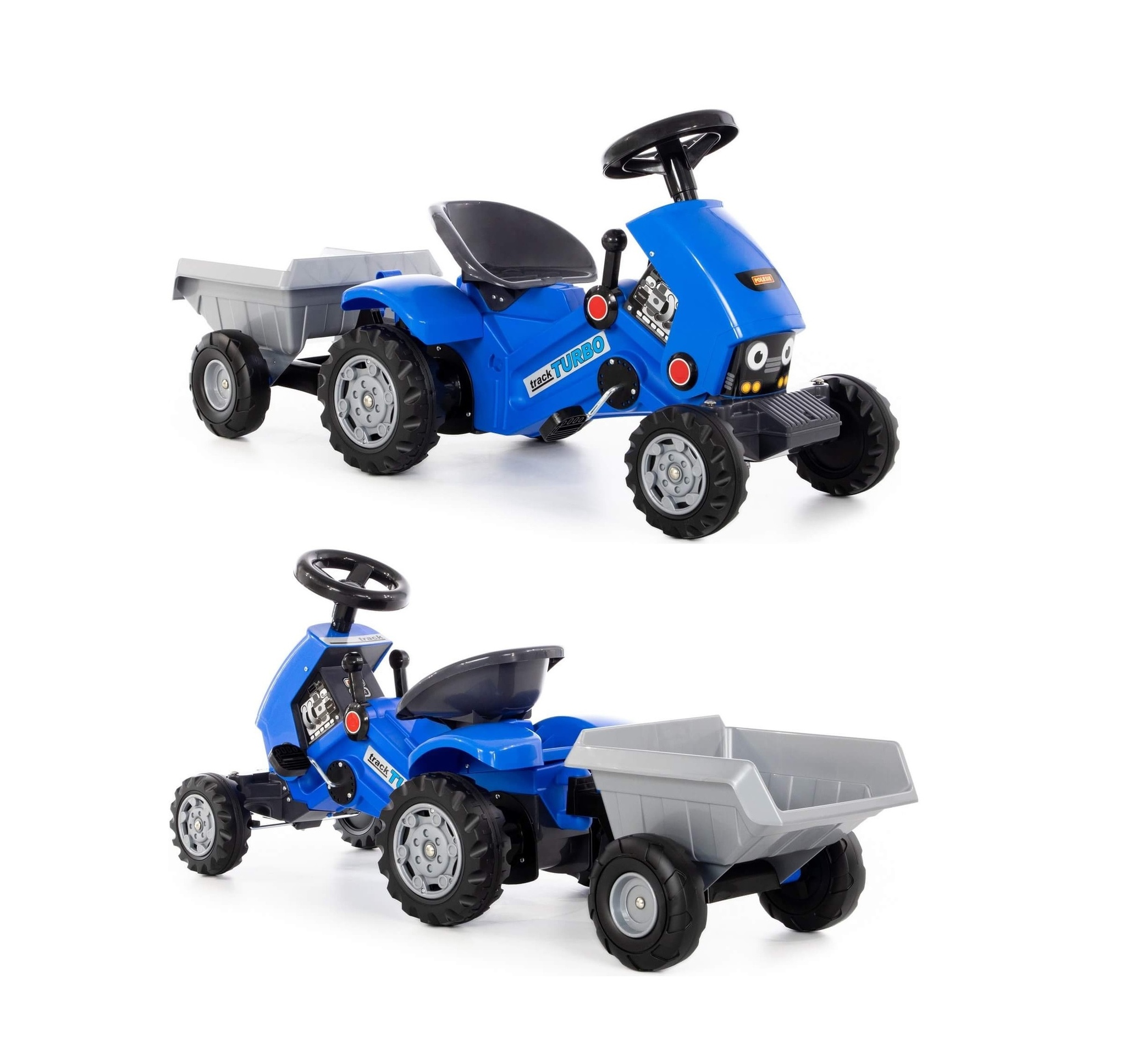 Трактор каталка с прицепом изготовлен из крепкого пластика по лицензии испанской компании Coloma y Pastor. Цвет синий. Полная длина с прицепом - 125 см. Высота посадки - 30 см