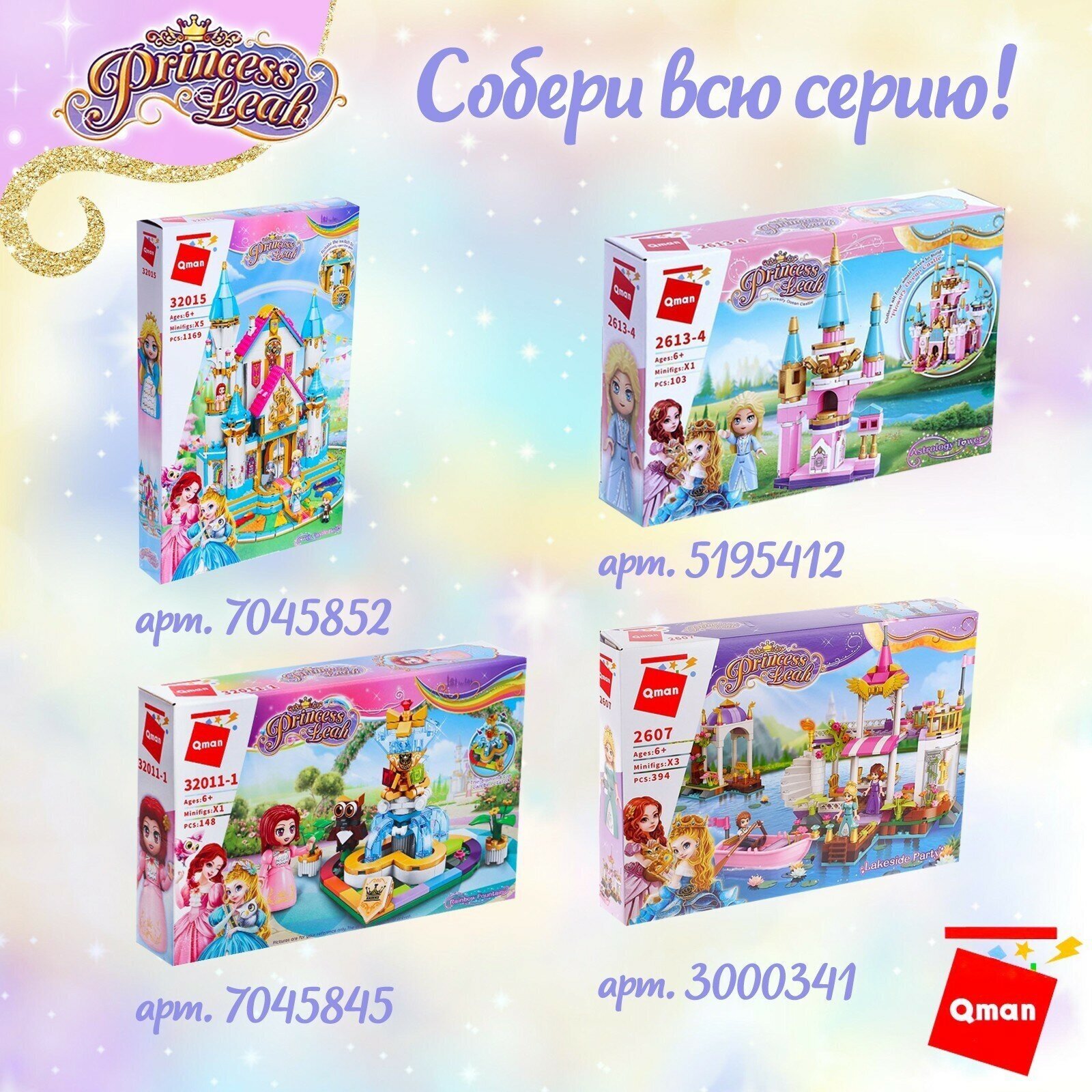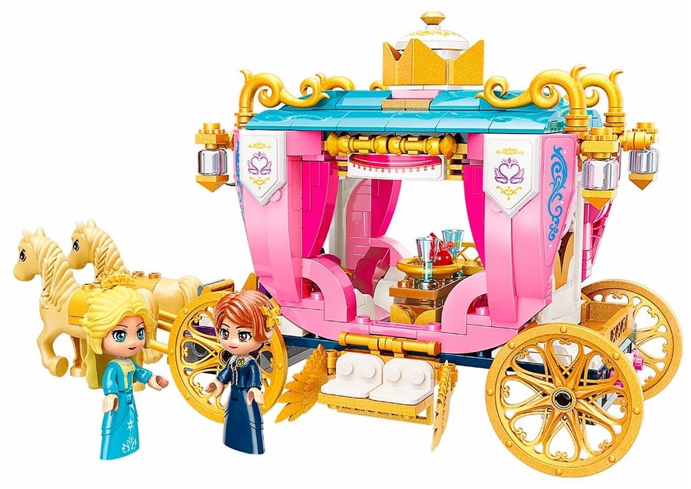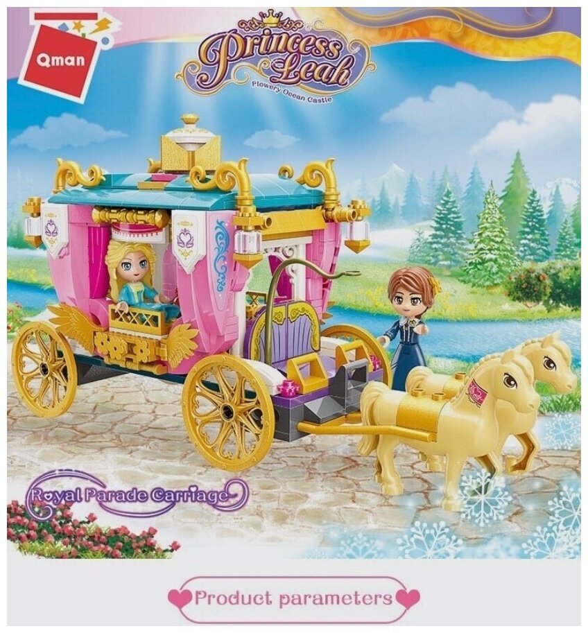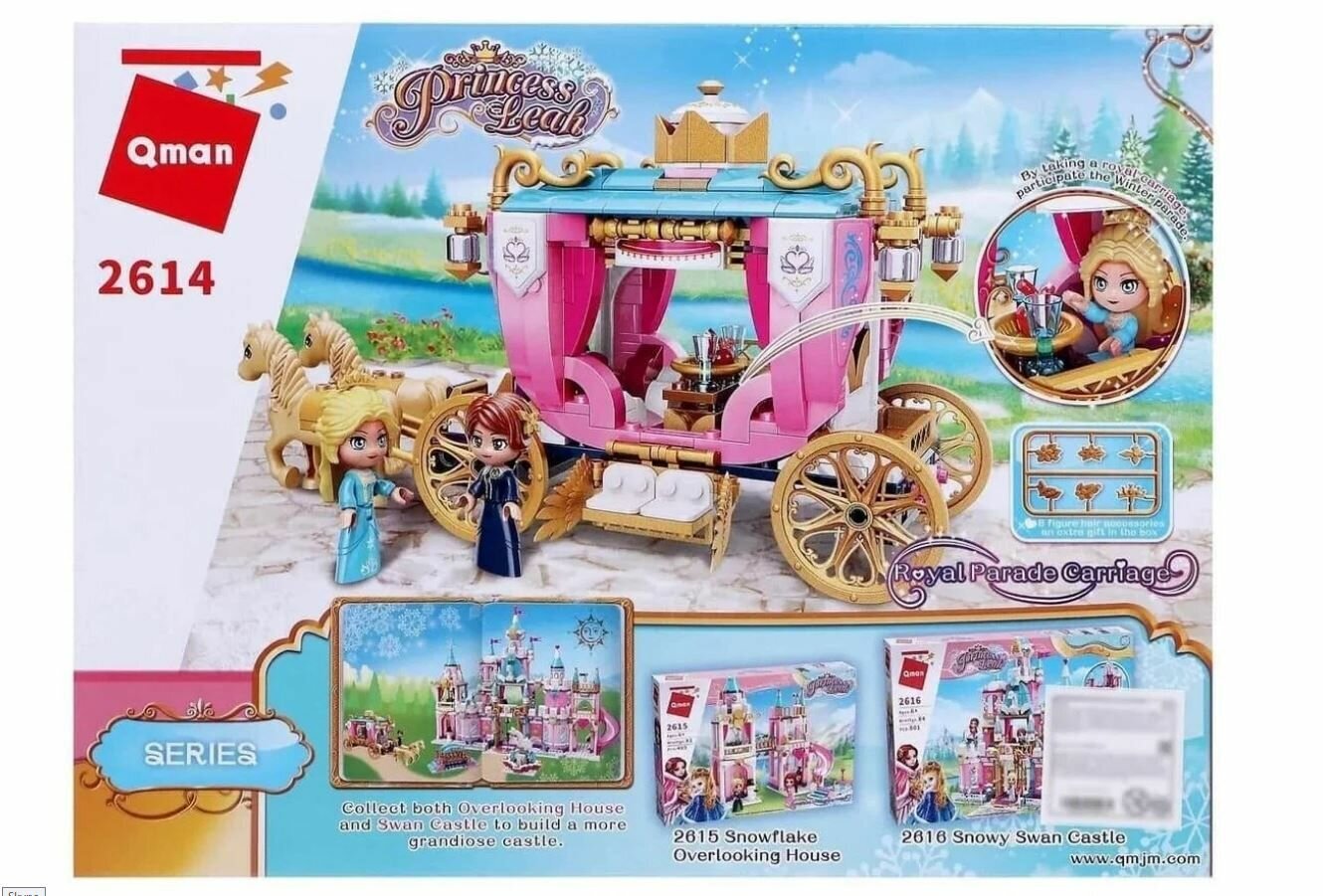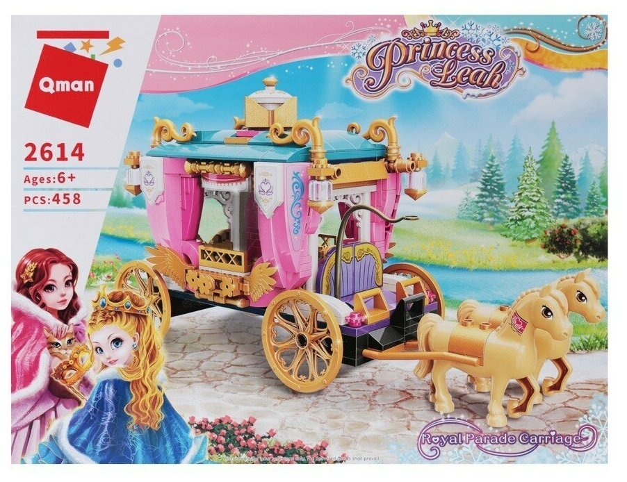 Конструктор «Принцессы: Золотая карета» от производителя Qman полностью совместим с Лего. Две красавицы королевских кровей собираются в путешествие. Великолепная карета украшена золотыми аксессуарами, позолоченными колесами и изысканными розовыми занавесками. В повозку впряжена пара шикарных лошадей светлой масти. Все готово к комфортной поездке по сказочным полям и лесам. Вместе с минифигурками двух принцесс создавайте свои игровые сценарии с нашим интернет-магазином. Волшебная дружба в Хартлейк Сити из мультсериала с радостью приветствует вас! Здесь вас ждет праздничное приключение в иглу и праздничный поход, а новогодний календарь поможет в каникулы: лыжная трасса и кафе на горнолыжном курорте зовут навстречу приключениям в походе. Для любителей активного отдыха есть приключения Мии в лесу и домик на дереве, рампа для скейта в Скейт-парке и американские горки на Волшебной ярмарке, кэмпинг на пляже, а так же лесной дом на колесах и парусная лодка, лесной водопад и пляжный дом для отдыха. Отправляйтесь в приключения Стефани для девочек на яхте без страха, ведь Морской спасательный центр поможет на задании, где есть морской спасательный самолет или морская спасательная лодка. Пляжный парк развлечений или парк аттракционов из мультика предлагает развлечения на пляже для серферов у бассейна или развлечение на пляжном багги, а еще Волшебное колесо обозрения и горка, Волшебная акробатика, Киоск на волшебной ярмарке и Волшебный караван, воздушный шар и корабль. Общественный центр Хартлейк-Сити включает Международную школу, Спортивный центр, Ботанический сад, закусочную в центре Хартлейк-Сити, магазины цветов и дизайна в центре, магазин органических продуктов, магазин пончиков, пиццерию Хартлейк Сити, Большой дом на главной улице и Гранд-отель Хартлейк Сити. Для любителей шопинга и красоты построены Торговый центр Хартлейк Сити, Магазин панкейков, Рынок уличной еды и Парикмахерская. А получить новые знания можно в Школе Хартлейк Сити, Художественной школе Эммы, Театральной школе Андреа, Космической академии Оливии и изобретений, а для веселья есть летний Аквапарк, Плавучий дом на канале, Кинотеатр Хартлейк-Сити и Диско-аркада для роллеров. В городке подружек есть много автомобилей: автобус для друзей, Электромобиль Оливии, Скорая ветеринарная помощь, Вездеход для спасения черепах, Фургон для спасения собак, Фургон отдела новостей, Мобильный домик, Мобильный магазин «Бабл Ти», Мобильный модный бутик, Фургон с мороженым, Грузовик для переработки отходов и Машина для посадки деревьев. Животные получают внимание и заботу: миссия в хартлейк сити, больница, Центр спасения собак, Спасательный велосипед для собак, Спасательная станция Мии для диких зверей, Кафе-приют для животных, Игровая площадка для зверей, Клиника для домашних животных, клуб тренировки лошадей и игра с ними, осенняя конюшня, конюшня для мытья пони и лесной клуб верховой езды. Настоящие друзья френд всегда рады встрече: минифигурки Лианн, Элла, Джонатан, Зак, Отэм, Габриэла, Чарли украсят комнату Новы, фигурки Джордин, Исаак, Олли, Нико, Мисс Мале, Ади, Фиона увидятся в комнате Лео, френдс человечки Изабелла, Райли, Виктория, Питер, Матильда, Гуннар, Марко построят Дом Пейсли, герои Кайла, Диа, доктор Марлон, Наоми украсят комнату Алии, а персонажи лучшие подруги Н
