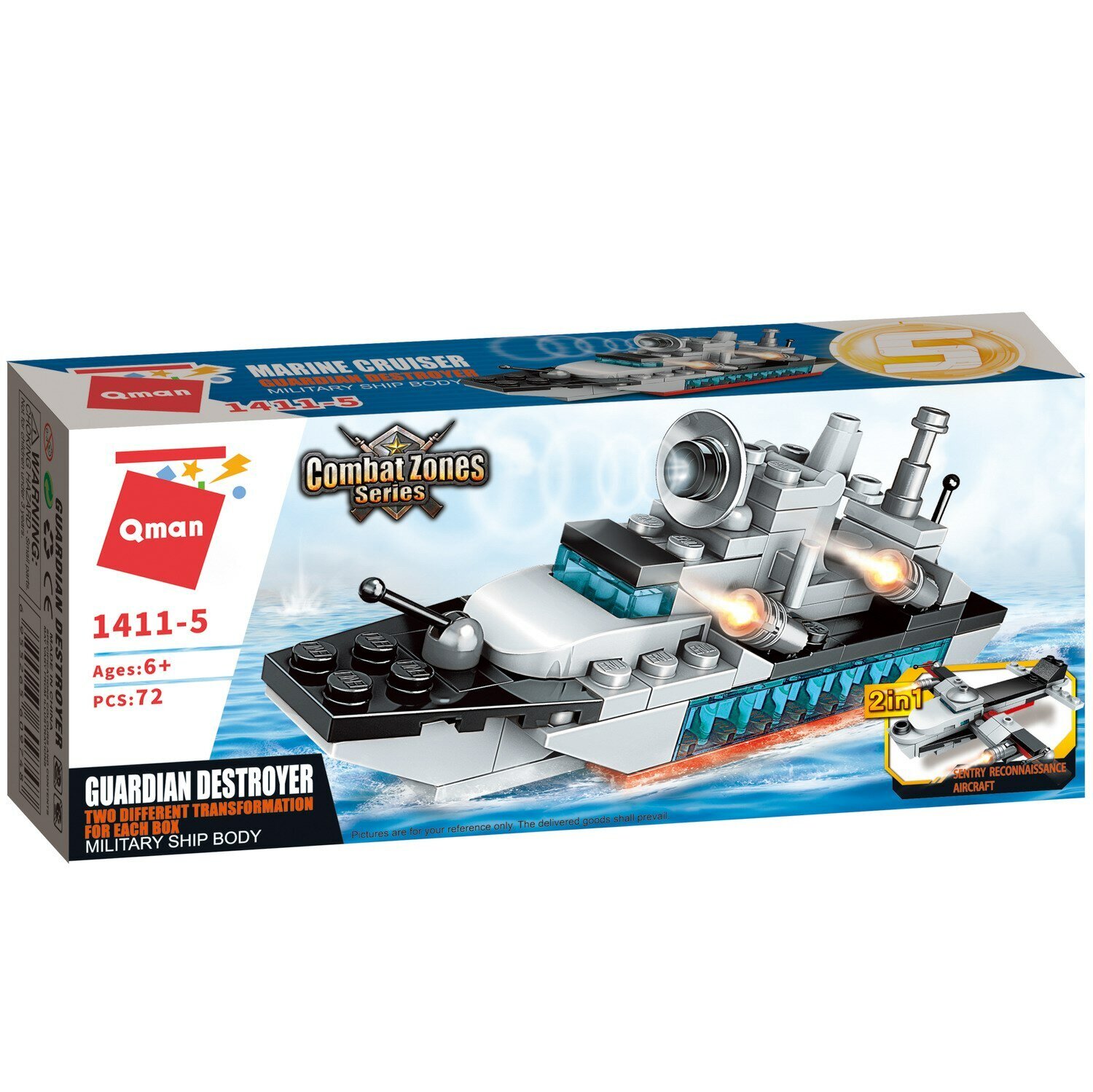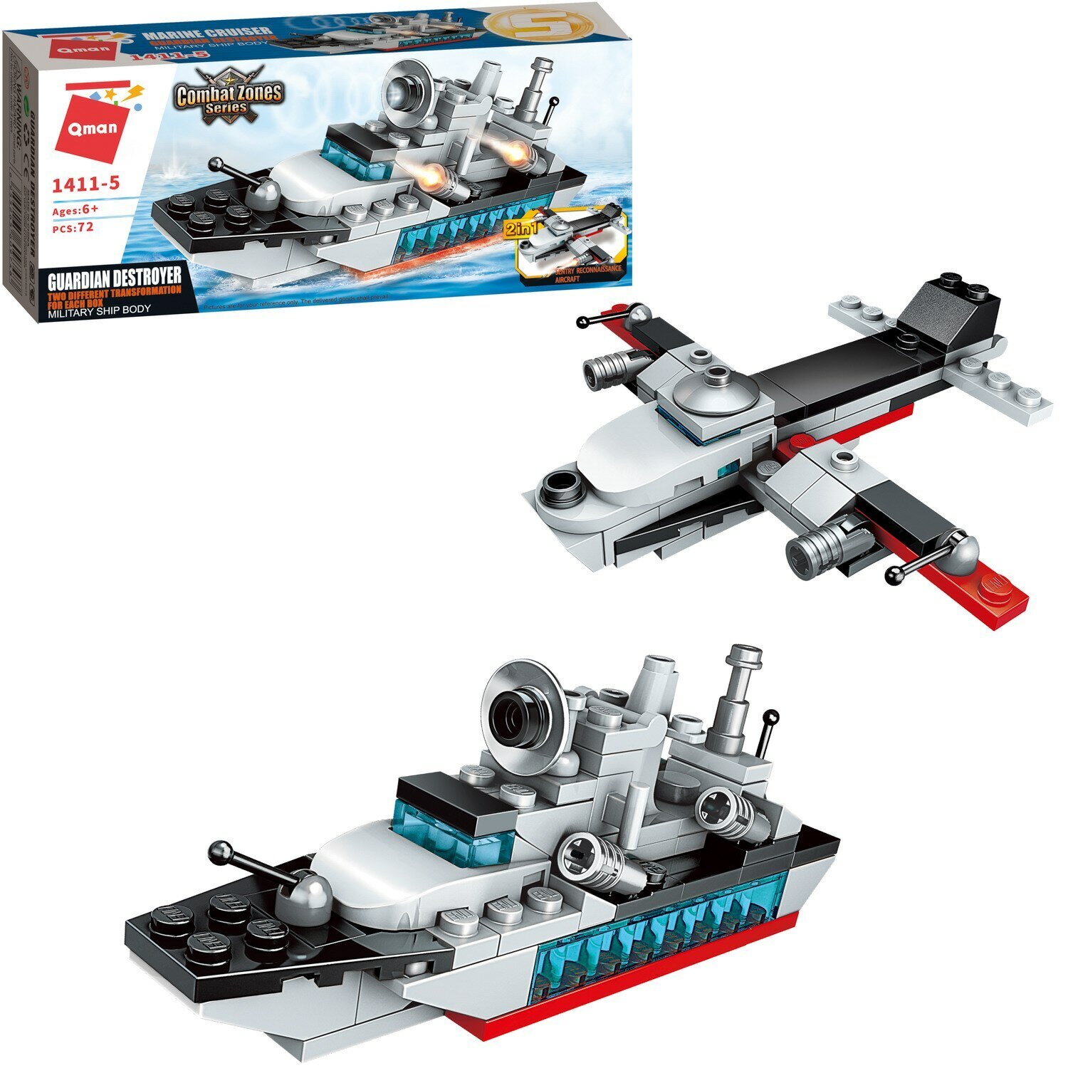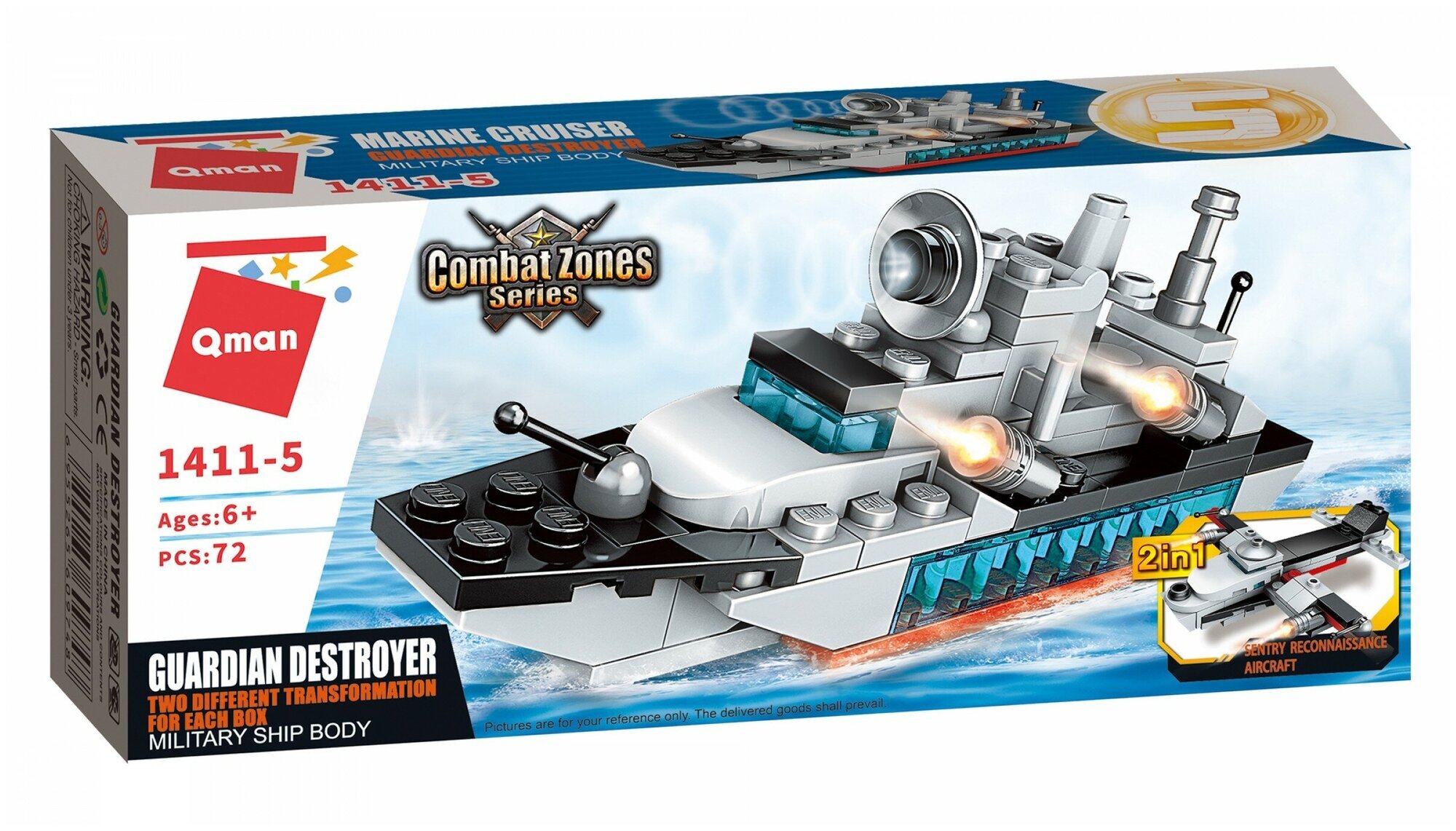 Конструктор Qman Combat Zone артикул 1411 серии "Боевая зона" Авианосец. Конструкторы - одни из самых популярных игрушек, которые развивают у ребенка мелкую моторику, координацию движений, творческое мышление, внимательность, терпеливость, усидчивость. Конструктор Авианосец, добавит в коллекцию вашего ребёнка морскую военную тематику. Интересный сюжет, сделает игру и сборку очень увлекательной. Из конструктора 1411-5 Ваш малыш сам или при помощи взрослых, сможет построить военный боевой корабль или самолет разведчика.
