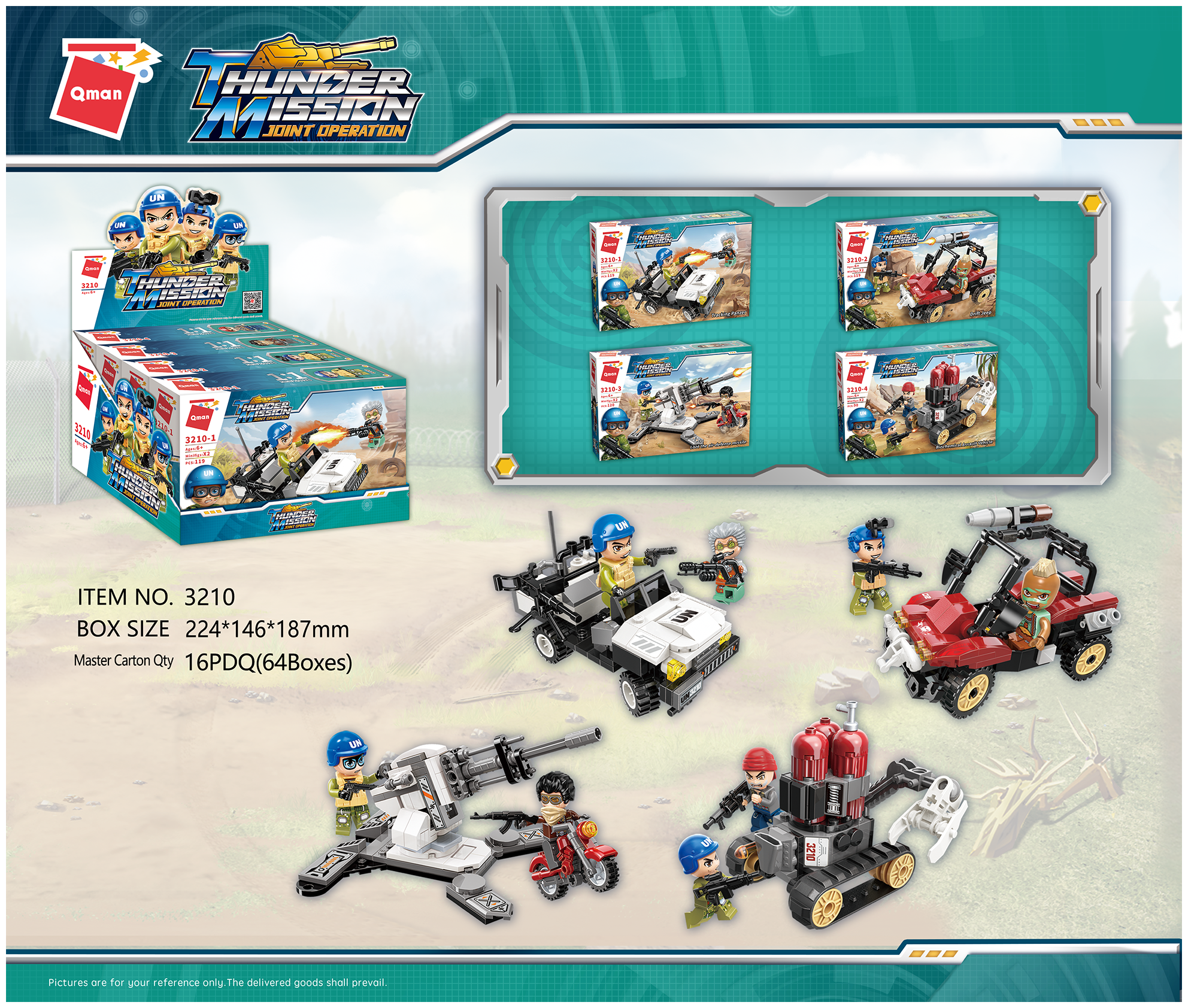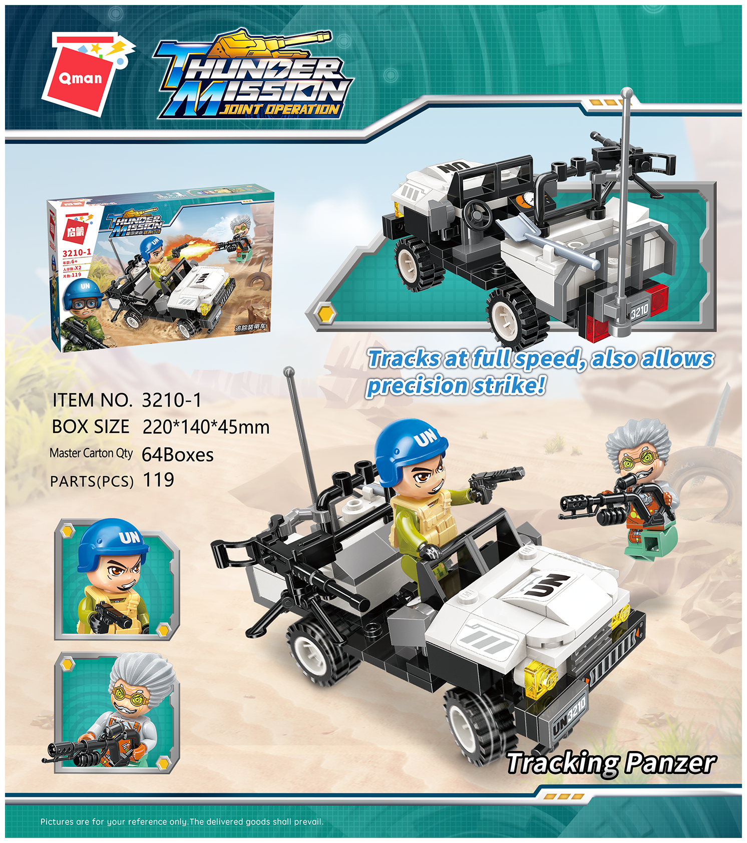 Конструктор серии "Военная спецоперация", от 90 дет, 3210 Qman. В серию входит четыре вида транспортных средств артикулы 3210-1 по 3210-4 . Стоимость конструктора указана за один вид из серии "Военная спецоперация" (цена за штуку). Из конструктора можно создать военный транспорт. В наборе есть один человечек. У вашего ребенка будет развиваться логическое мышление и мелкая моторика рук. Дети могут устроить настоящие военные баталии. Ребёнок останется довольным. Состав: пластик. Размер упаковки, см: 22х5х13 Вес, кг: 0,211