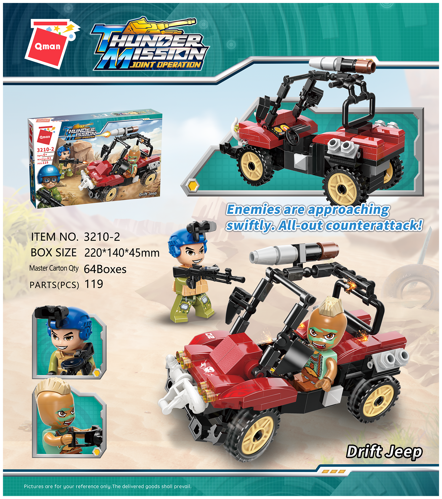 Конструктор серии "Военная спецоперация", от 90 дет, 3210 Qman. В серию входит четыре вида транспортных средств артикулы 3210-1 по 3210-4 . Стоимость конструктора указана за один вид из серии "Военная спецоперация" (цена за штуку). Из конструктора можно создать военный транспорт. В наборе есть один человечек. У вашего ребенка будет развиваться логическое мышление и мелкая моторика рук. Дети могут устроить настоящие военные баталии. Ребёнок останется довольным. Состав: пластик. Размер упаковки, см: 22х5х13 Вес, кг: 0,211