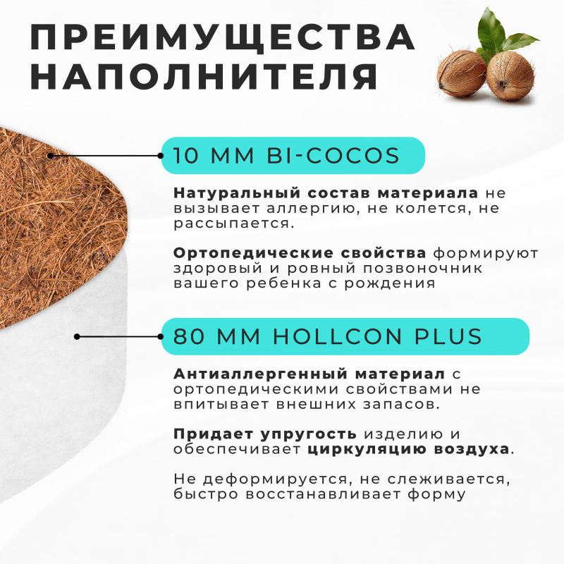 БиКокос - комбинированное нетканое полотно, изготовлено из кокосового волокна 50% и полиэфирного волокна 50%. Идеально поддерживает влагообмен во время сна, не пахнет и не вызывает аллергии.