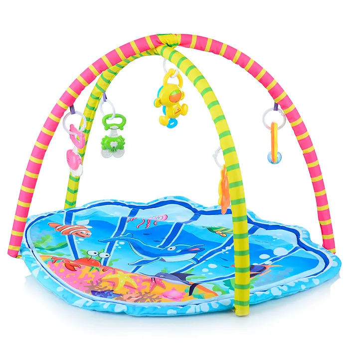 Детский развивающий коврик подходит для малышей с самого рождения. Он сделан из мягкой и очень приятной на ощупь ткани. Над ковриком расположены 2 дуги, к которым прикреплено 5 весёлых игрушек-погремушек. Кроха будет тянуться к этим ярким и интересным игрушкам, совершенствуя мелкую моторику, развивая зрительное восприятие, хватательный рефлекс и тактильные ощущения. Размер коврика (ДхШ) составляет 76х63 см, длина дуг: 126 см, длина подвесных игрушек: 10-12 см. Изготовлено из текстильных материалов с элементами пластмассы. Рекомендованный возраст: 0 мес.