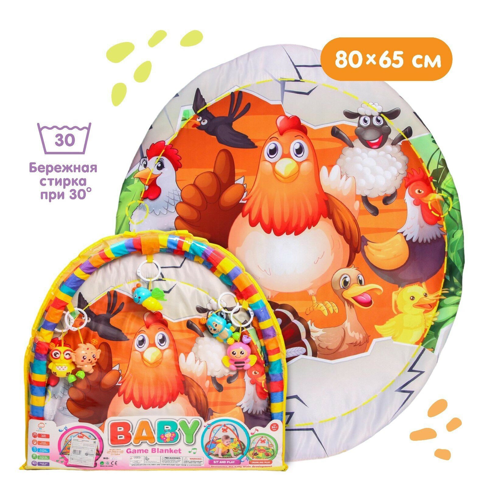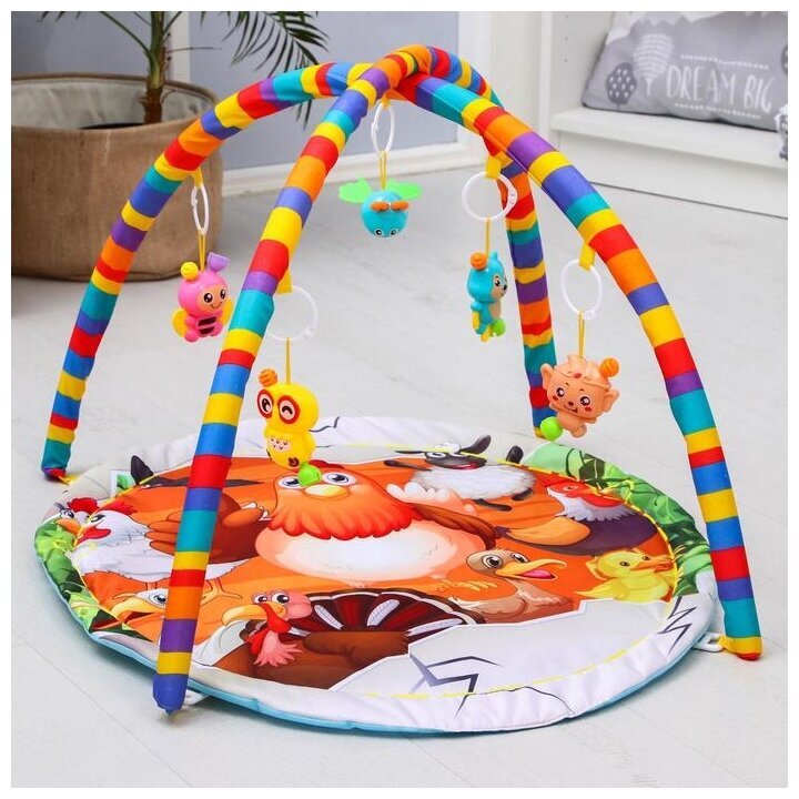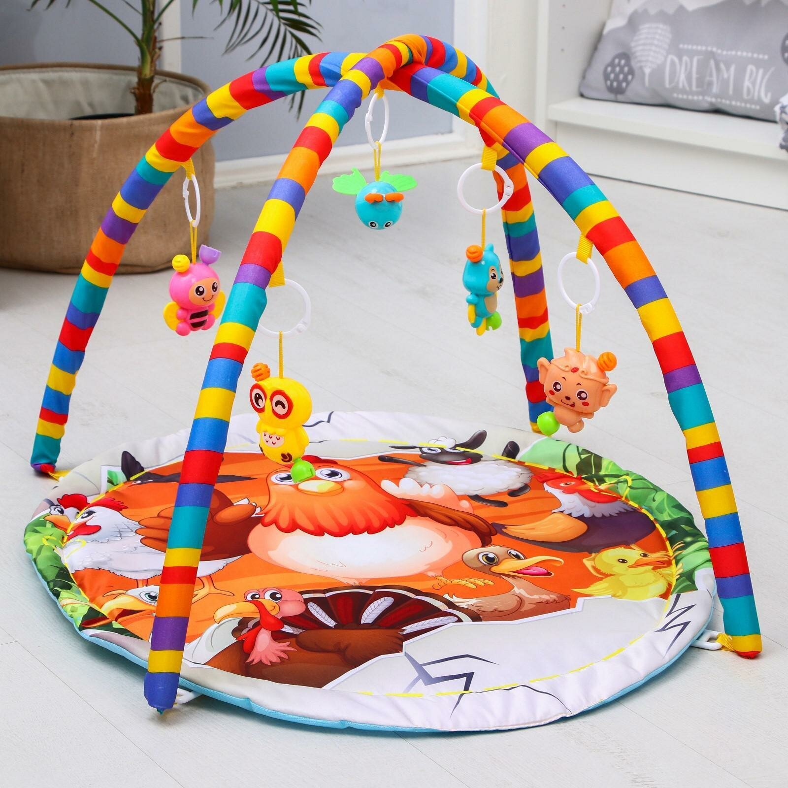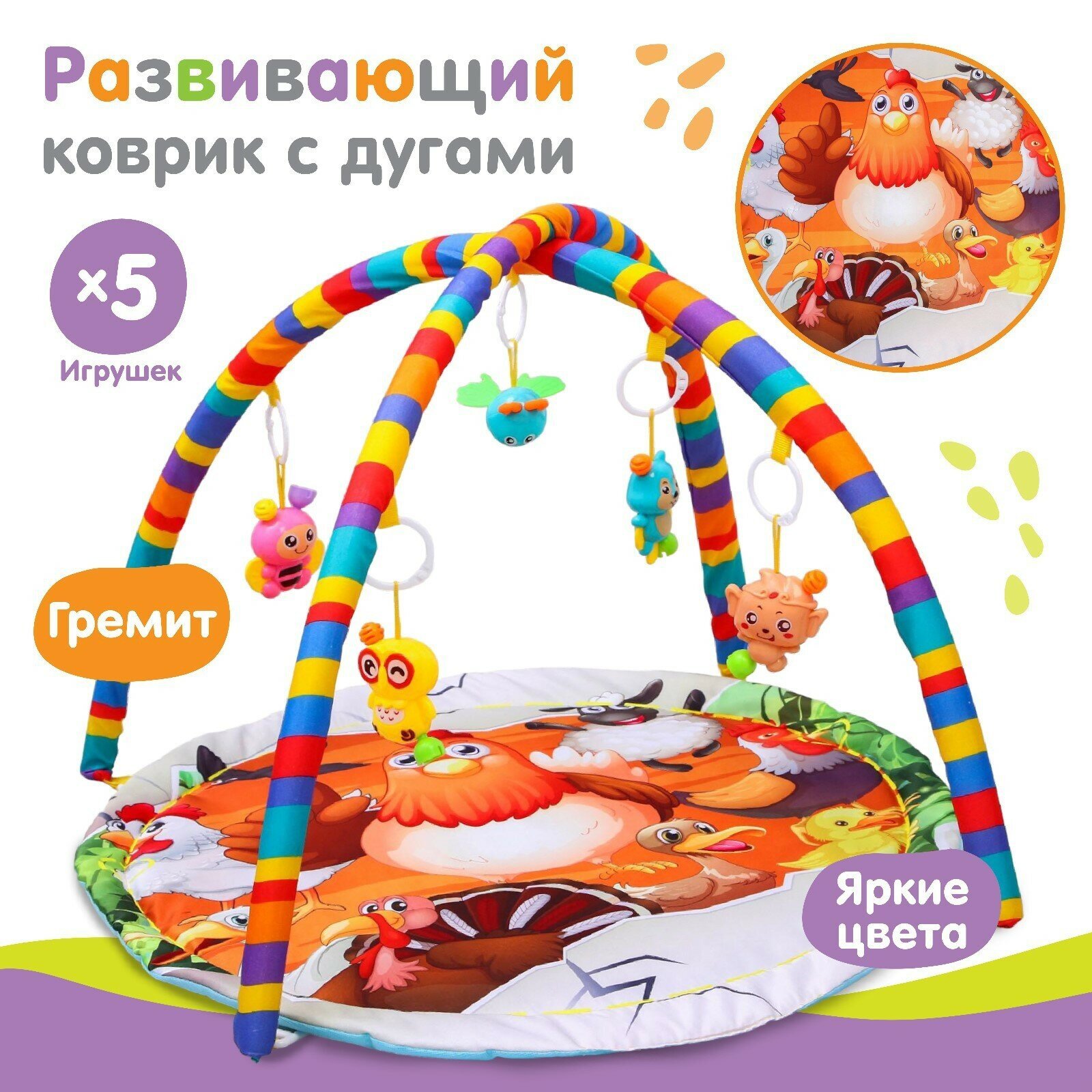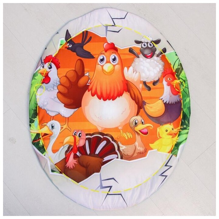 Развивающий коврик с дугами и игрушками «Домашние животные», круглый Уникальный, мягкий, развивающий коврик, с эластичным, безопасным зеркальцем, поможет занять малыша пока мама занимается домашними делами. Предлагаем вам познакомиться с играми на разные возраста: 0-2 месяца: Малыш играет на спинке лёжа. На самом раннем этапе своего развития малыш тянется за яркими, притягивающими внимание игрушками и учится их хватать, так же малыш видит свое отражение в безопасном зеркальце и улыбается. В комплекте с ковриком прилагаются подвесные игрушки, яркие и привлекательные, они служат для развития тактильных ощущений и зрения. 2-6 месяцев: Кроха играет, лёжа на животике. Когда малыш научится лежать на животике, игрушки можно будет снять с дуг и передвинуть их на край. Крохе будет интересно добраться до них самостоятельно, брать в ручки и изучать их. 6 месяцев и старше: играем с ковриком. Когда малыш научится сидеть, дуги можно будет снять и далее использовать коврик как пространство для игр. Коврик можно выносить с собой на природу, брать на дачу и использвать как безопасное место для игр с различными игрушками.