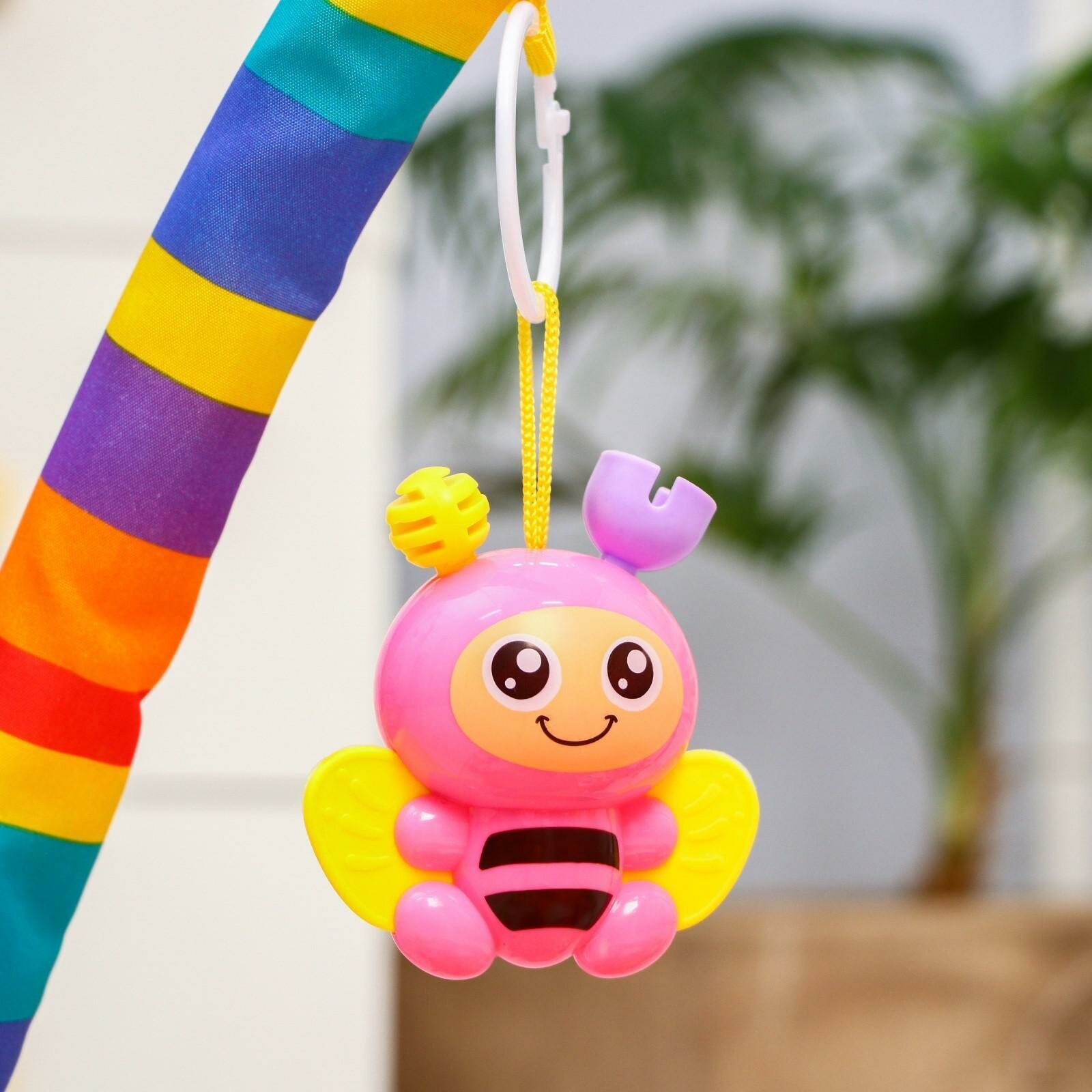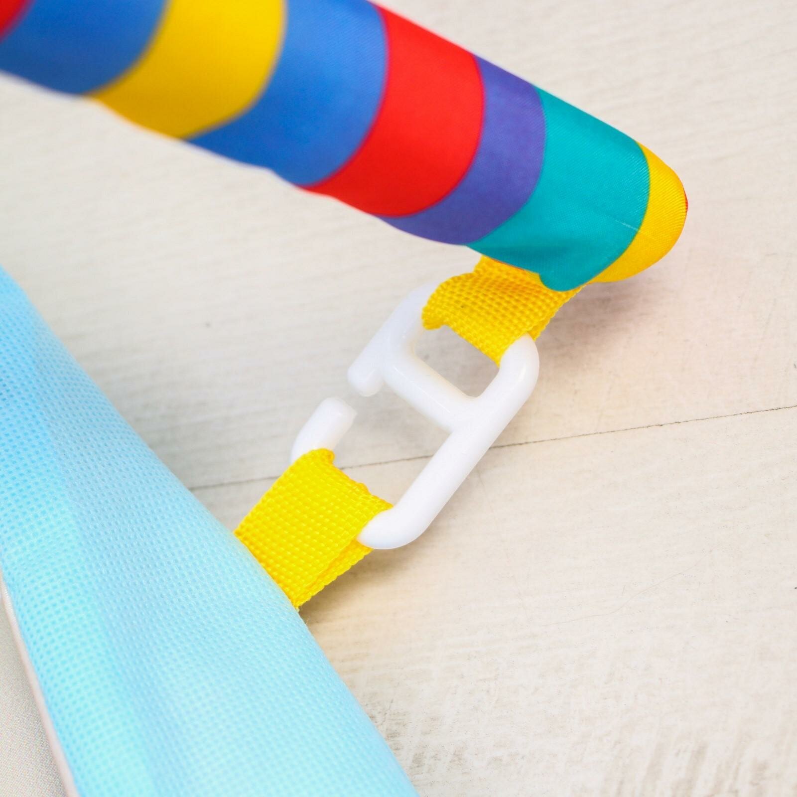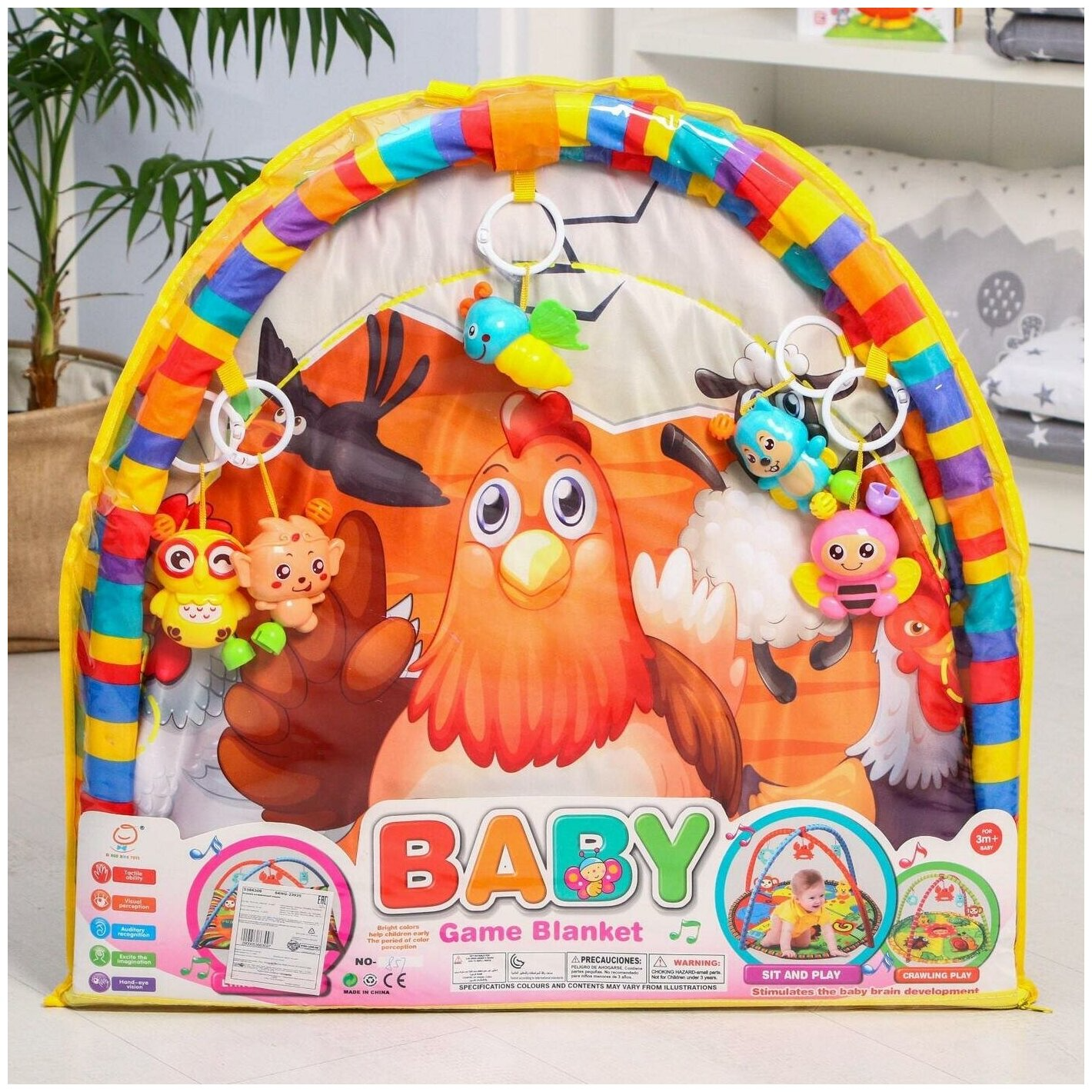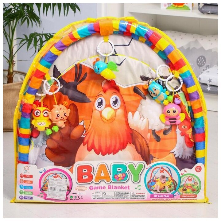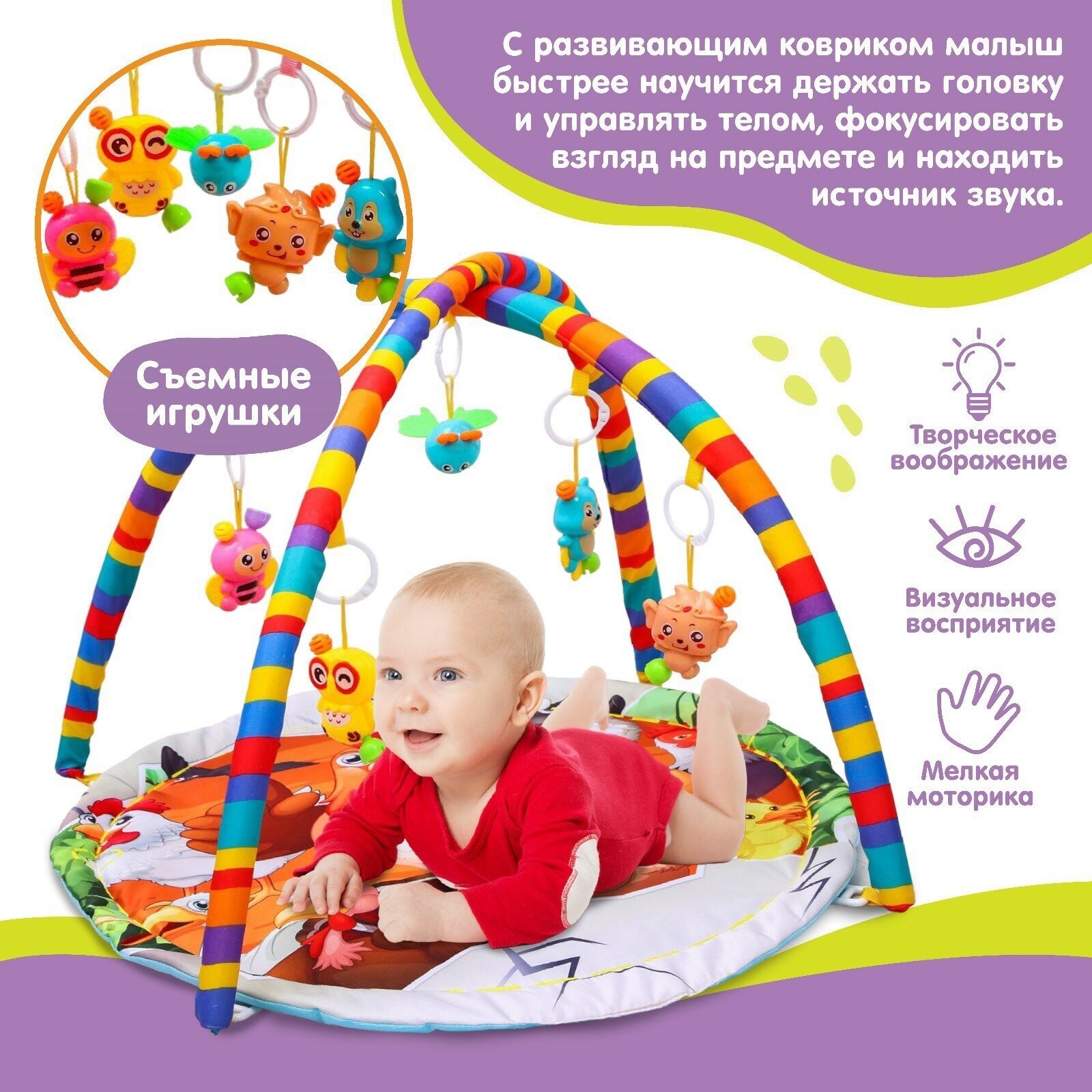 Развивающий коврик с дугами и игрушками «Домашние животные», круглый Уникальный, мягкий, развивающий коврик, с эластичным, безопасным зеркальцем, поможет занять малыша пока мама занимается домашними делами. Предлагаем вам познакомиться с играми на разные возраста: 0-2 месяца: Малыш играет на спинке лёжа. На самом раннем этапе своего развития малыш тянется за яркими, притягивающими внимание игрушками и учится их хватать, так же малыш видит свое отражение в безопасном зеркальце и улыбается. В комплекте с ковриком прилагаются подвесные игрушки, яркие и привлекательные, они служат для развития тактильных ощущений и зрения. 2-6 месяцев: Кроха играет, лёжа на животике. Когда малыш научится лежать на животике, игрушки можно будет снять с дуг и передвинуть их на край. Крохе будет интересно добраться до них самостоятельно, брать в ручки и изучать их. 6 месяцев и старше: играем с ковриком. Когда малыш научится сидеть, дуги можно будет снять и далее использовать коврик как пространство для игр. Коврик можно выносить с собой на природу, брать на дачу и использвать как безопасное место для игр с различными игрушками.